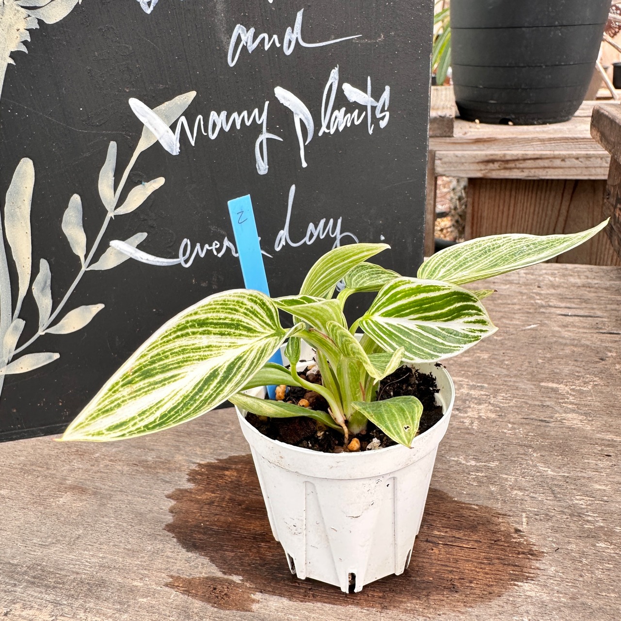 「フィロデンドロン・バーキン」は、斑入りの葉が美しい園芸品種で、白くくっきりとした葉脈が印象的。