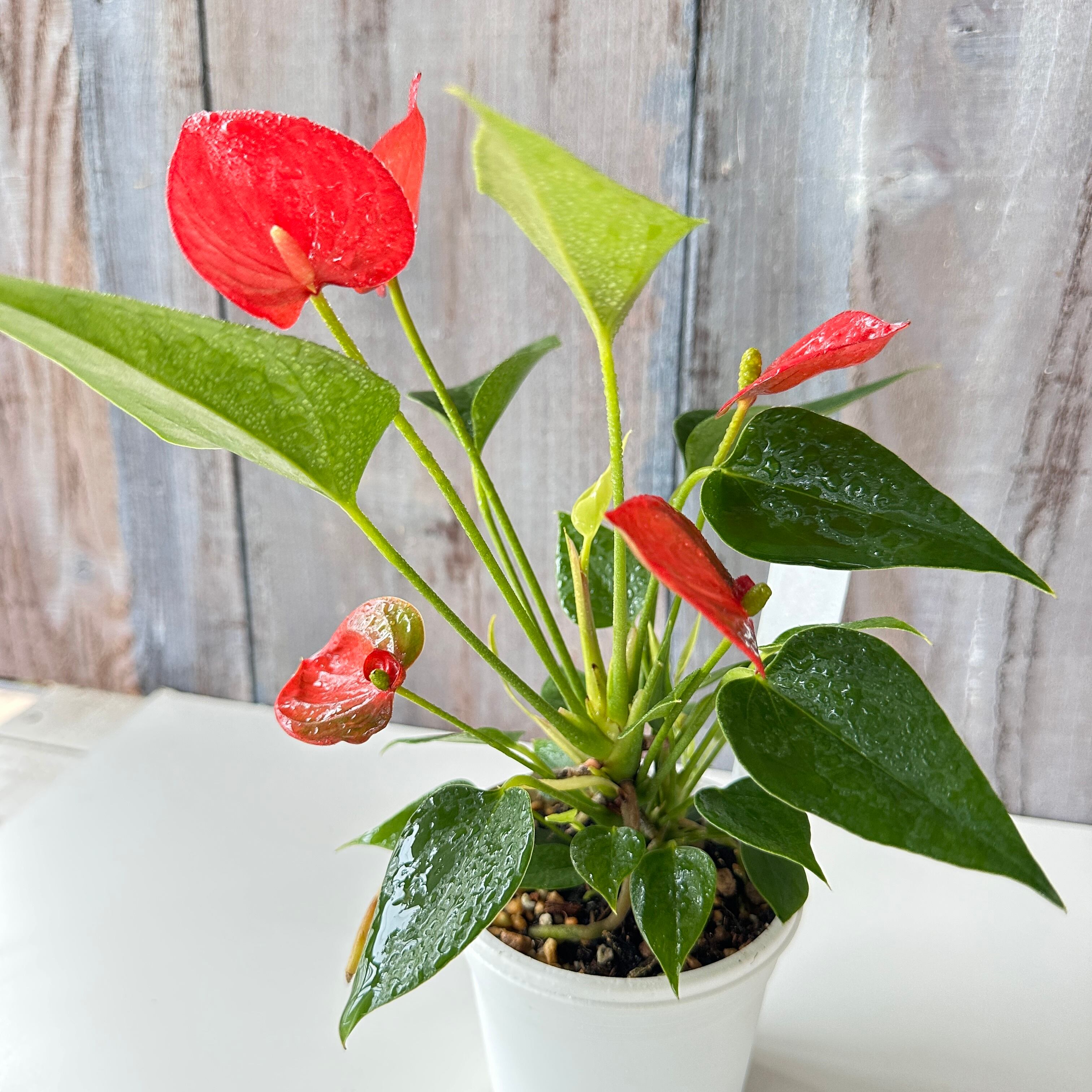 花を楽しむ種類の主な原種は、アンドレアヌム(Anthurium andraeanum)で、その園芸品種は鉢物としてよく出回っているほか、切り花としても利用されています。また光沢のある葉も美しく、ハワイではバレンタインデーに贈る花として人気があります。