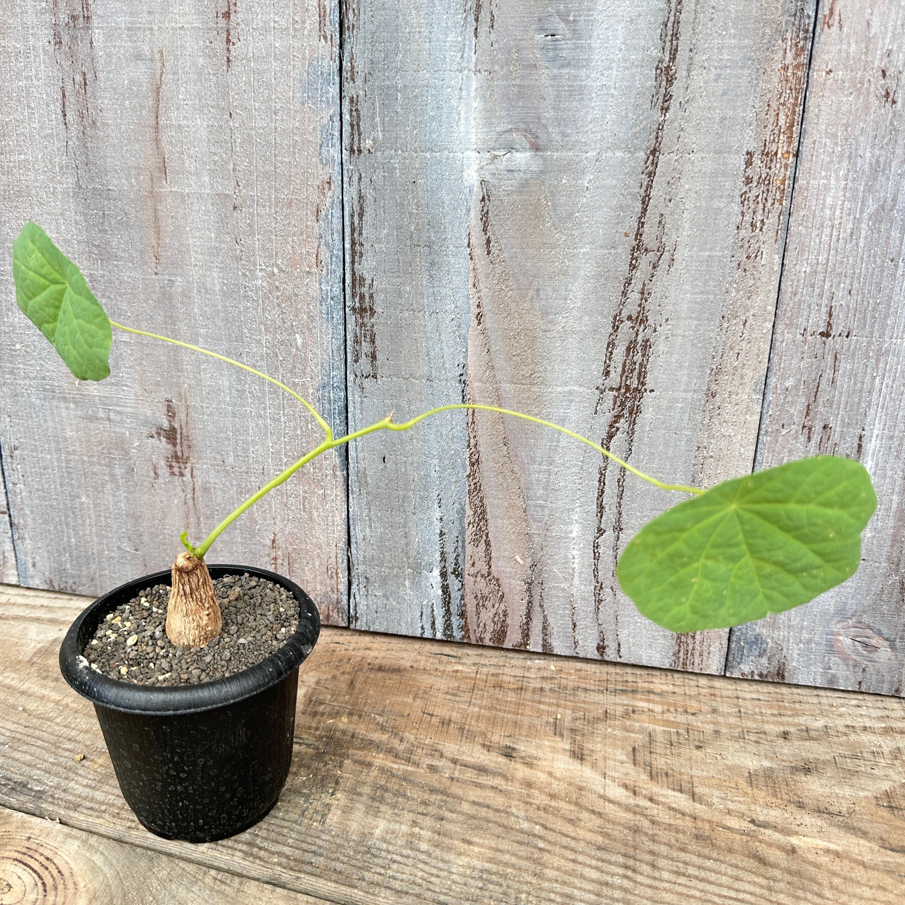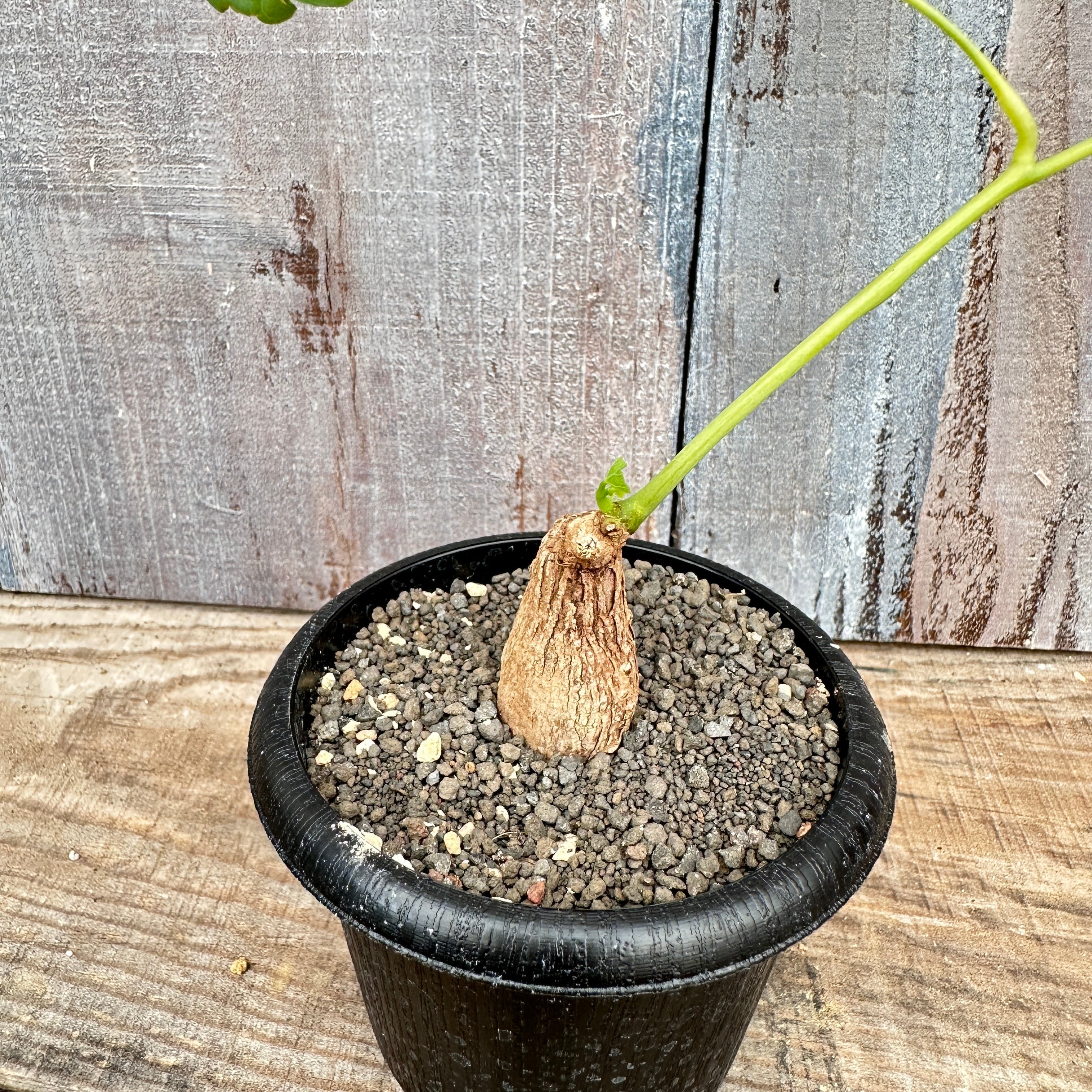 東南アジアの熱帯雨林に自生する塊根植物で、世界に約35種、日本に1種あります。 塊根部(芋部)からツルを伸ばして成長し、蓮のような葉を茂らせます。 夏型の植物なので冬には落葉し、かわいいイモだけの状態になります。