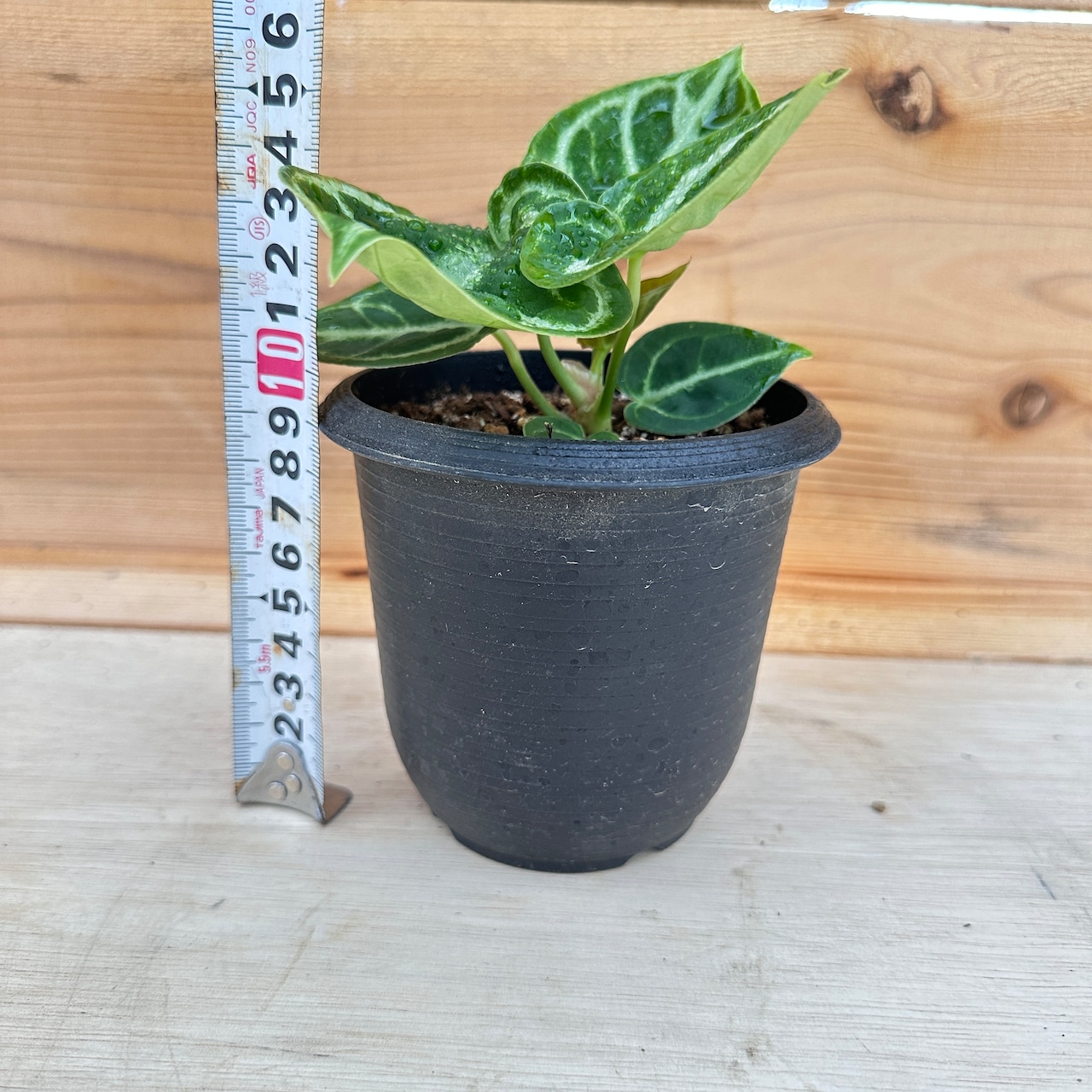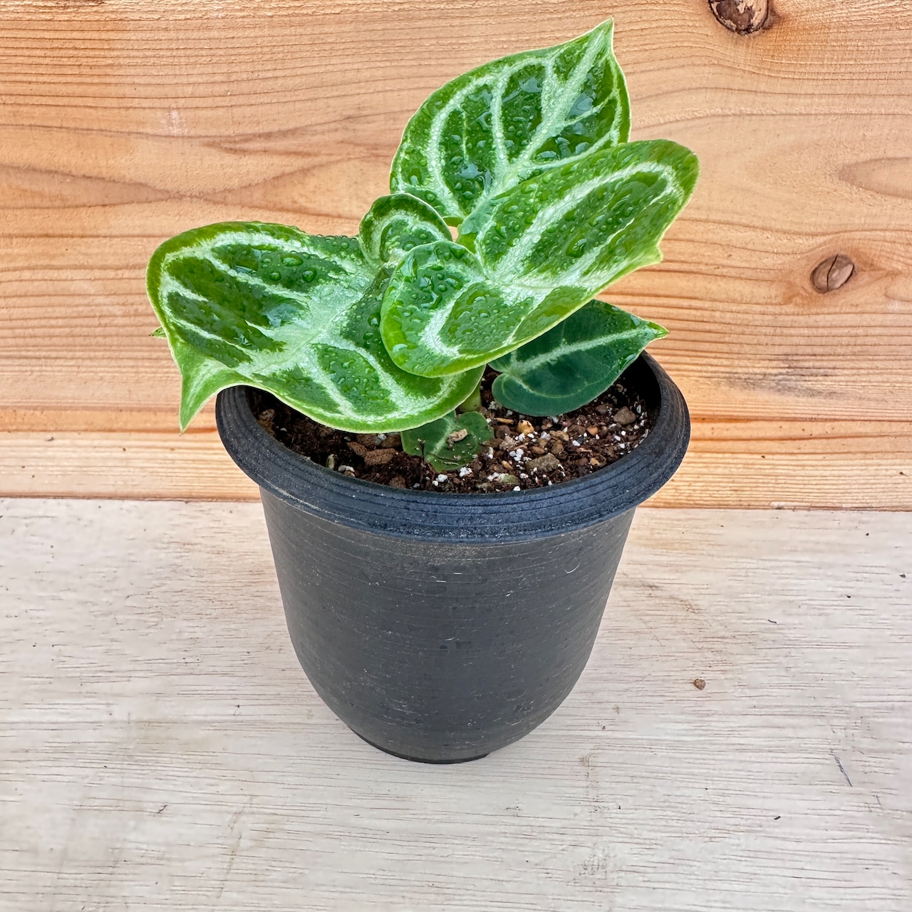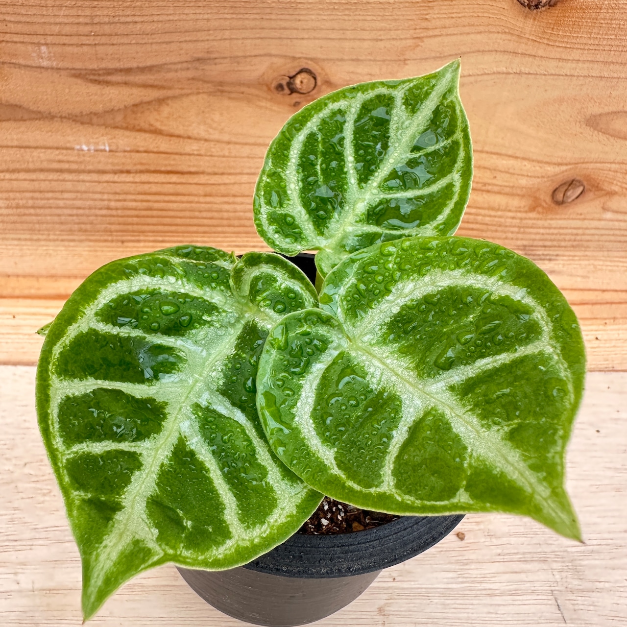 アンスリウム クリスタリナムは、ハート形の葉にシルバーに輝く葉脈を持つ観葉植物です。